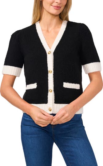 Contrasting trim frames this polished, wool-kissed cardi knit with short sleeves and detailed with shiny golden shield buttons.