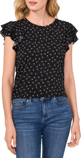 Charming ditsy floral print decorates a crepe-knit top flounced with a double row of ruffles at the sleeves.