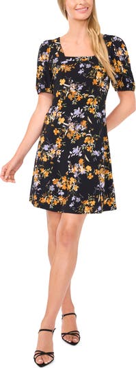 Romantic blooms decorate this soft crepe-knit dress made with a square neckline and lightly puffed short sleeves.