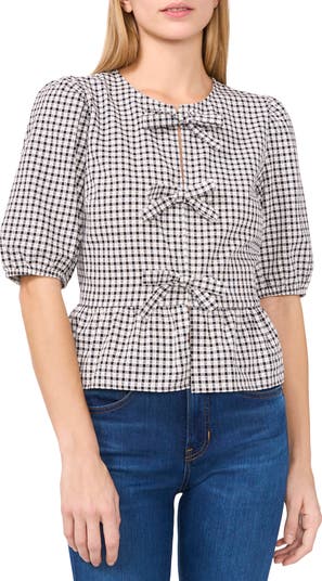 Crafted from crisp cotton covered in preppy gingham checks, this cute top with three bows at the front is finished with a flouncy peplum.