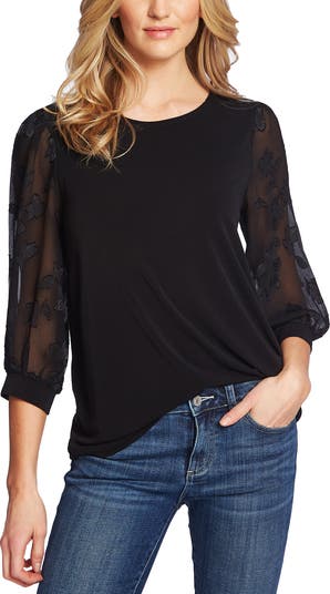 Elegance and ease balance beautifully in this charming blouse that features billowing, lace-laden sleeves.