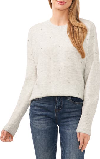 Sparkling rhinestone embellishments bring a glam element to a crewneck sweater knit with dropped shoulders and a slouchy fit.