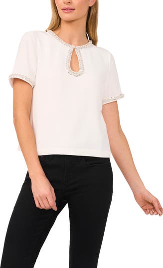 Pearly beads and flashing crystals instantly accessorize a keyhole top cut from soft crepe for a look that works for fun or fancy.