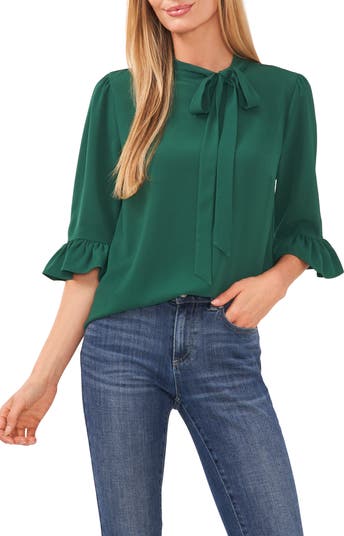 A tied neckline and frill-finished sleeves add grace notes to this desk-to-dinner blouse.