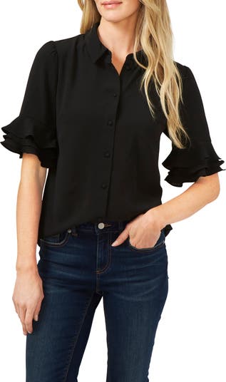 Pretty and polished, this button-up shirt crafted of stretch crepe is framed by abbreviated sleeves with decadent layered ruffles.
