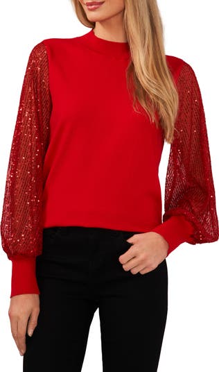 Glittery sequined mesh sleeves frame this soft cotton-blend sweater topped with a sophisticated mock neck.