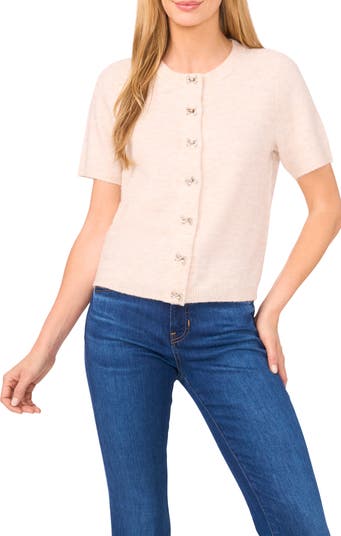 Statement bow buttons sweeten the classic look of a fuzzy short-sleeve cardigan that's just right for wearing on its own.