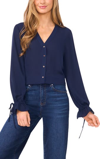 Full of romance, this blousy georgette button-up top is framed by billowed sleeves with dainty ties at the flared cuffs.