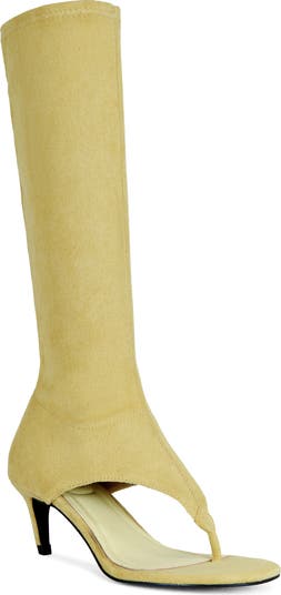 With a style that fuses a thong sandal and a stretchy knee-high boot, this unexpectedly breezy shoe is sure to turn heads.
