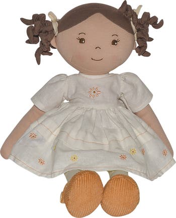 An all-natural linen dress adorns an adorable, soft doll with sweet pigtails that's ready to provide cuddles for your little one.