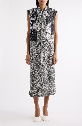 Van Noten successor Julian Klausner continues the iconoclastic Belgian designer’s bold pattern play in this silk-rich midi dress, where expressive brushstrokes form a hazy garden of abstract flora—reflecting the rich tonal contrasts of the winter ’25 collection. Style the sweeping ties in neat bow or leave them undone for a carefree look.