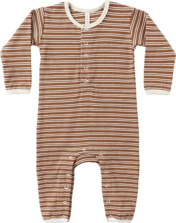 Slim stripes enliven this playtime-ready rib-knit romper designed with snaps at the front and between the legs for easy changes.