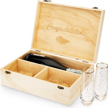 Say congratulations with the best gift possible--champagne! Gift a special bottle of bubbles in style with our wood champagne box and flute set for a celebratory gift that is sure to stand out.