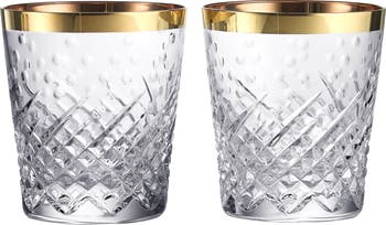 Light plays and dances across the delicate, shimmering olive cuts, deep, striking karo cuts and golden rims of this set of two tumblers that add a touch of elegance to every pour.
