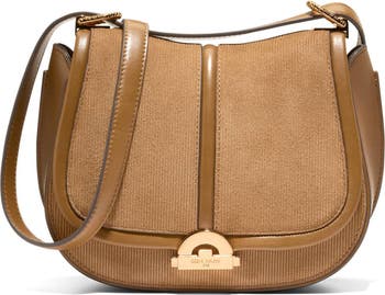 Offering a playful twist on the label's logo, a gleaming clasp secures the flap of this shoulder bag crafted in a rounded saddlebag-inspired silhouette in either textured suede or lizard-embossed leather.