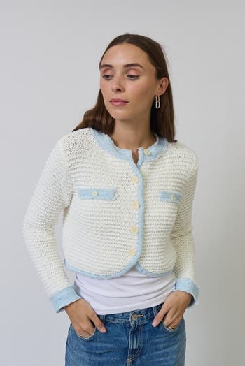 This textured knit piece delivers a refined, classic aesthetic in a modern cropped silhouette. Functional chest pockets and contrast trim add tailored detail, while soft fabrication ensures structured comfort for polished, versatile styling.