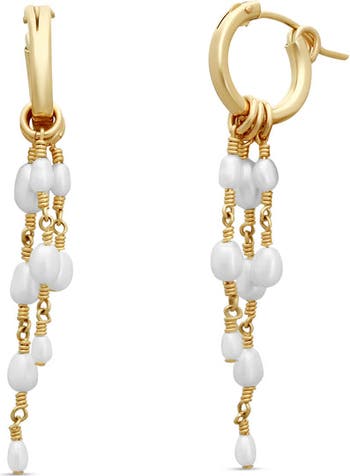 These pearl cascading earrings feature freshwater pearls, hand wire-wrapped and suspended from 14K gold-filled hoops for soft movement and luminous dimension.