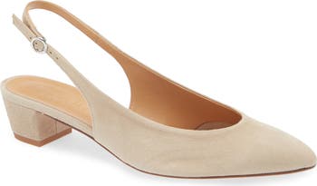 An almond toe furthers the streamlined aesthetic of an Italian-made slingback pump featuring a supple suede upper and set on a low block heel.