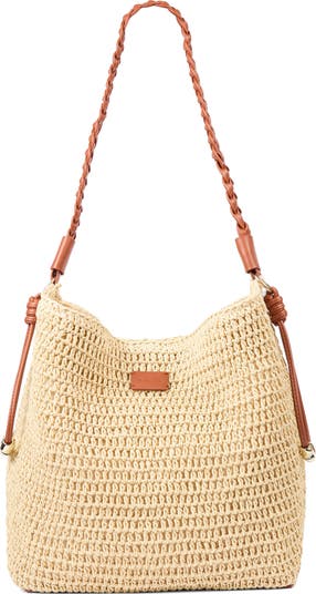 Supple faux-leather accents highlight the finely woven exterior of a slouchy tote designed with a roomy interior and suspended from a braided shoulder strap.