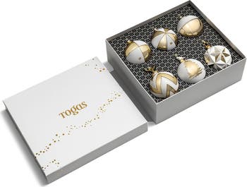 A Christmas baubles set Celestia is made of glass and includes 6 exquisite baubles decorated with various custom-made gold and snow-white patterns which make them dressy and festive.