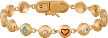 Let the universe envelop you in positive vibes and walk with confidence in your step. This bracelet features a variety of symbols meant to help repel negativity and welcome prosperity. The intricate symbols charms are decorated with shimmering 2.5 mm Cubic Zirconia, all set in 18K Gold-plated Brass for a stunning look. When you wear the “Celestial Blessings Multi-Symbol Bracelet” you will feel an increase of inner peace as new opportunities open up. Wear this bracelet to achieve your dreams.