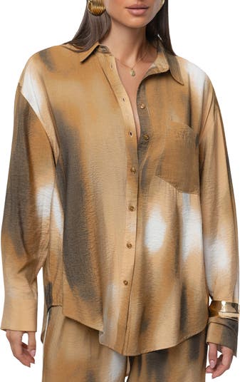 Dropped shoulders enhance the blousy fit of this lightweight crinkled shirt covered in a mesmerizing print.