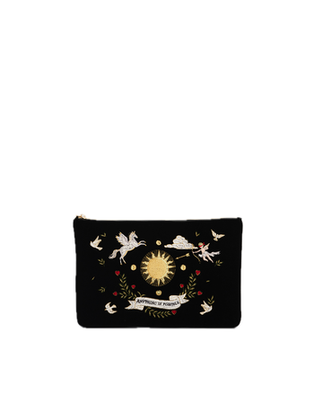 Keep your essentials in celestial style with our velvet pouch. This luxurious black velvet pouch features exquisite embroidery of a Pegasus and a cherub dancing around a radiant golden sun, complete with a delicate, inspiring message: "Anything is Possible." Finished with a gold zip and fully lined. Perfect for storing your everyday treasures or as a statement clutch, this beautifully crafted piece brings wonder to wherever you go.