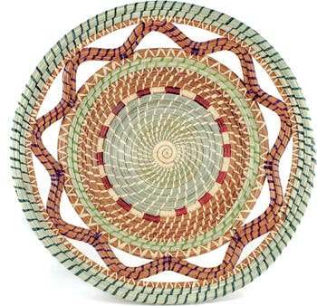 Stunning Celestina Basket handcrafted of pine needles and pajon (a native grass of Guatemala) bound together in an intricate design executed in both natural and dyed raffia. With a wide shallow bowl shape with gently sloping sides, this pine needle basket is wonderful to display and functional as well. Handmade and fair trade. Pine needles and raffia 14" wide, 2" high