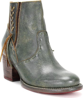 - Western-inspired ankle boot with leather inlay details ending in tassel, hidden goring