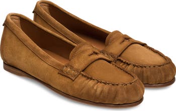 A geometric penny keeper and gathered moc toe bring distinct elements to a Spanish-made loafer shaped in a streamlined silhouette from supple suede.