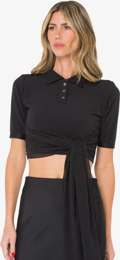 The Cella Top is a contemporary take on the classic polo, reimagined with elevated detailing and versatility. Crafted in a sleek black knit, it features a structured collar with a button placket and short sleeves. What sets this piece apart is the chiffon tie detail—an elegant, fluid wrap that can be styled multiple ways: knotted in front, wrapped around the waist, or draped to the side for a fashion-forward effect.