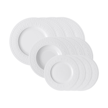Cellini is a Villeroy & Boch modern classic: understated elegance with a clean form and design for casual dining or gourmet entertaining. Inspired by the detailed work of Italian Renaissance artist Benvenuto Cellini, this collection is sophistication made simple. The twelve piece set includes 4 each: dinner plate, salad plate and soup/pasta plate. Earn yourself a little more leisure time with dishwasher safe durability and microwave safe convenience. High-quality German-made porcelain provides upscale appeal and lasting durability. Villeroy & Boch has been a premium manufacturer of fine porcelain, glassware, flatware, and more since 1748; This is proudly manufactured in our German factory.