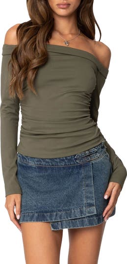 Fall for the close fit of this stretchy shoulder-baring top shaped by rippled side ruching.