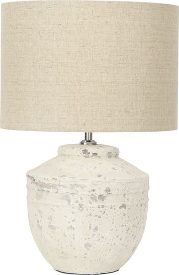 Add some style and personality to the space with this distressed white cement table lamp that showcases a distressed white cement base, topped with a beige linen drum shade. This table lamp is a rustic and boho-inspired addition to the home décor, as it features a cement base that has a round shape and a distressed white finish that creates a vintage look. The beige linen drum shade creates a cozy and inviting light that complements the cement base. This table lamp is suitable for any room that needs some extra texture and charm, such as the living room, bedroom, office, or any other area. It can also be a great gift for anyone who loves rustic and boho design. This table lamp requires one 40-watt bulb (not included) and is equipped with an in-line switch for easy on and off. It measures 13 inches round x 18.75 inches in height, and the cord length is 5 feet. Add this distressed white cement table lamp to the home and enjoy its beauty and functionality.