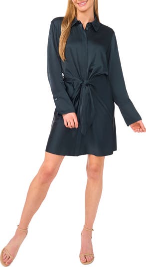 Shirtdress style gets a glow-up with a twist-tied center and a lustrous satin fabrication.
