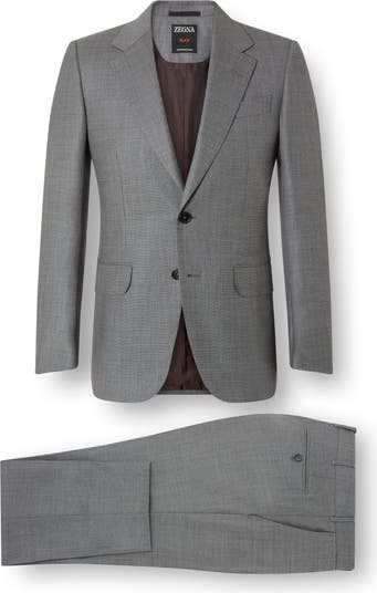 The luxurious high-thread-count wool fabric—named for the Italian word for 120,000—gives this versatile suit its rich texural dimension. Precise pickstitching showcases the label's scrupulous attention to detail.