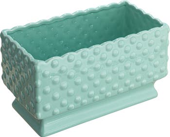 This mint ceramic hobnail planter is a blend of vintage charm and modern elegance, featuring an intricate hobnail texture, scalloped edge, and playful polka dots. It's perfect for showcasing a variety of plants, from vibrant blooms to greenery. The planter is versatile and can be placed on windowsills, mantelpieces, or bookshelf, adding personality and timeless beauty to any space. Crafted from durable ceramic, it's a cherished addition to the home for years to come. The planter is spacious and deep, suitable for indoor or outdoor use and can match any décor style, from cottagecore to vintage to farmhouse. The planter measures 11.25 inches in length, 5.75 inches in width, and 6 inches in height. It's a perfect gift for those who love ceramic and hobnail decor.