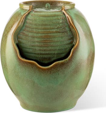 This chic and interesting ceramic tabletop fountain featured with delicate embossed leaves texture, as well as the elegant and charming kiln-fired sage green glaze finish with antique details that brings a touch of artistic and natural beauty to your space. Water flowing across the front wall and spilling into the bottom basin, the soothing sound of cascading water helps to create a relaxing and meditative atmosphere. This versatile fountain will be a warm and delightful addition to any of your garden, porch or home space.