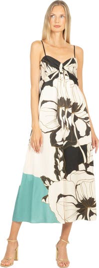 A classic and sophisticated dress with a self-tie ribbon and front slit. The unique mixed polka dot print adds a chic feel to the look.