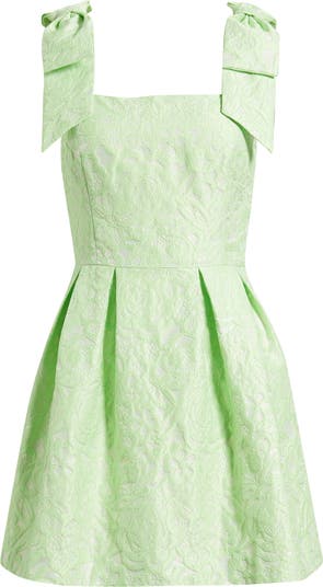 Hidden shorts add coverage to this lacy dress topped by bows at the shoulders and made with pleats at the skirt.