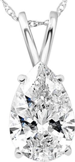 This classic solitaire pendant features one pear shape 2 ct lab grown diamond. The diamond is prong set in a 14k white gold setting. An 18" 14k white gold clasp lock chain is included. IGI certificate is included.