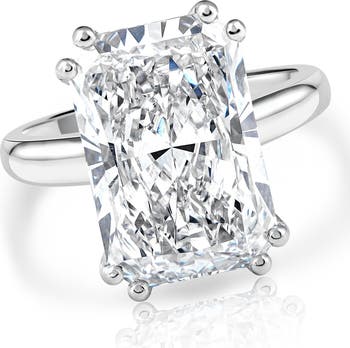 This large and sparkly womens engagement ring features a 4ct certified GH color VS clarity radiant cut genuine lab grown diamond. The diamond is prong set in 14k white gold high polished mounting. Finger size 7. The diamond and ring includes an authentic IGI certification confirming the authenticity.