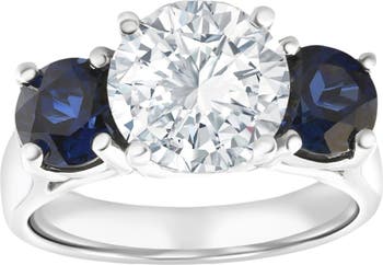 This stunning women's engagement ring features a large 2ct round brilliant cut IGI certified lab grown diamond. The diamond is prong set in solid 14k white gold and flanked by two round brilliant cut lab created blue sapphires. Finger size 6.5 only.