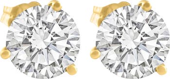 Massive matching pair of womens earrings features two round brilliant cut lab grown diamonds. The diamonds are prong set in solid high polished 14k yellow gold mountings. The earrings are secured with push backs.