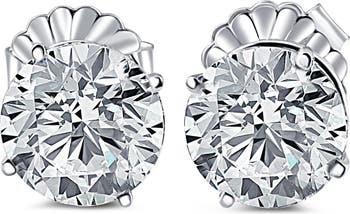 Massive matching pair of womens earrings features two round brilliant cut lab grown diamonds. The diamonds are prong set in solid high polished 14k white gold mountings. The earrings are secured with jumbo durable tension earring back