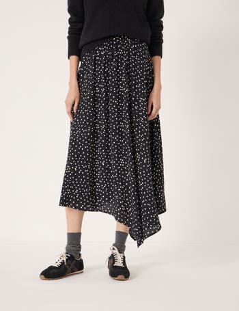 Effortlessly elegant midi skirt, tailored with a flowing asymmetric hem and gentle pleats for graceful movement, ideal for weekend wandering and polished everyday layering.
