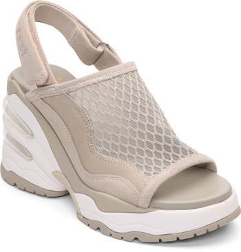 A bubble-cushioned wedge heel elevates this mesh slingback sandal that brings sport inspiration to the forefront.