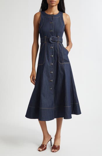 Dark-wash denim with contrast stitching gives this sleeveless midi dress its elevated workwear edge, while vertical seaming shapes a close-fitting bodice that releases into a full A-line skirt with deep pockets and a removable self belt.