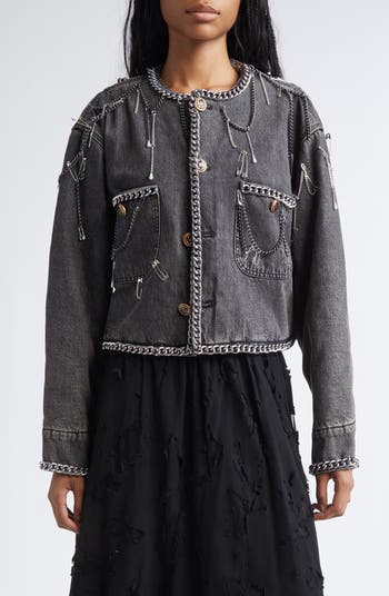A subtly cropped chore coat in faded grey-wash denim is given the label's signature punk, grunge-inspired aesthetic with draping chains and paper-clip embellishments.