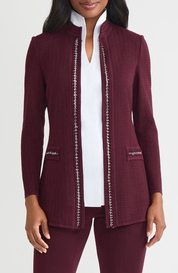 Chain-link trim adds an extra flash of sophistication to a fitted knit jacket that's sure to elevate your look.